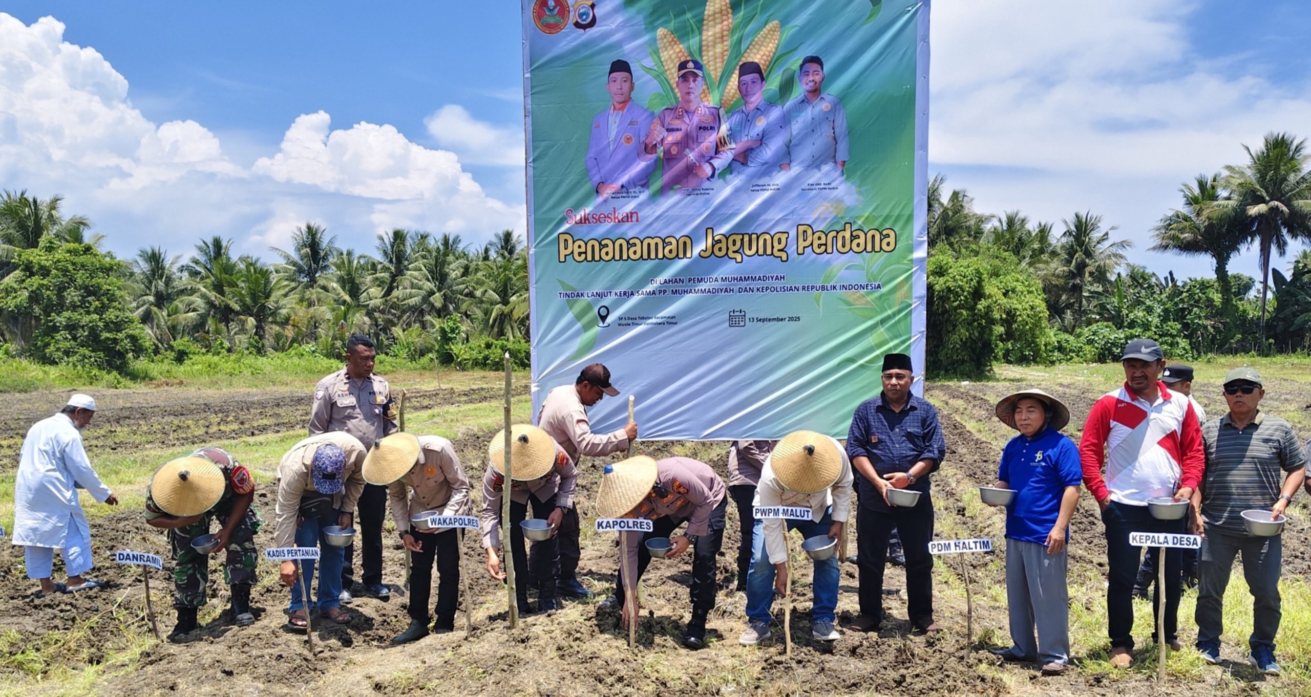 Halmahera Timur – Dalam rangka mendukung program ketahanan pangan nasional, Pimpinan Daerah Pemuda Muhammadiyah (PDPM) Halmahera Timur bersama Kepolisian Republik Indonesia melaksanakan kegiatan penanaman jagung sebagai bagian dari program pemberdayaan masyarakat dan penguatan sektor pertanian di Halmahera Timur.