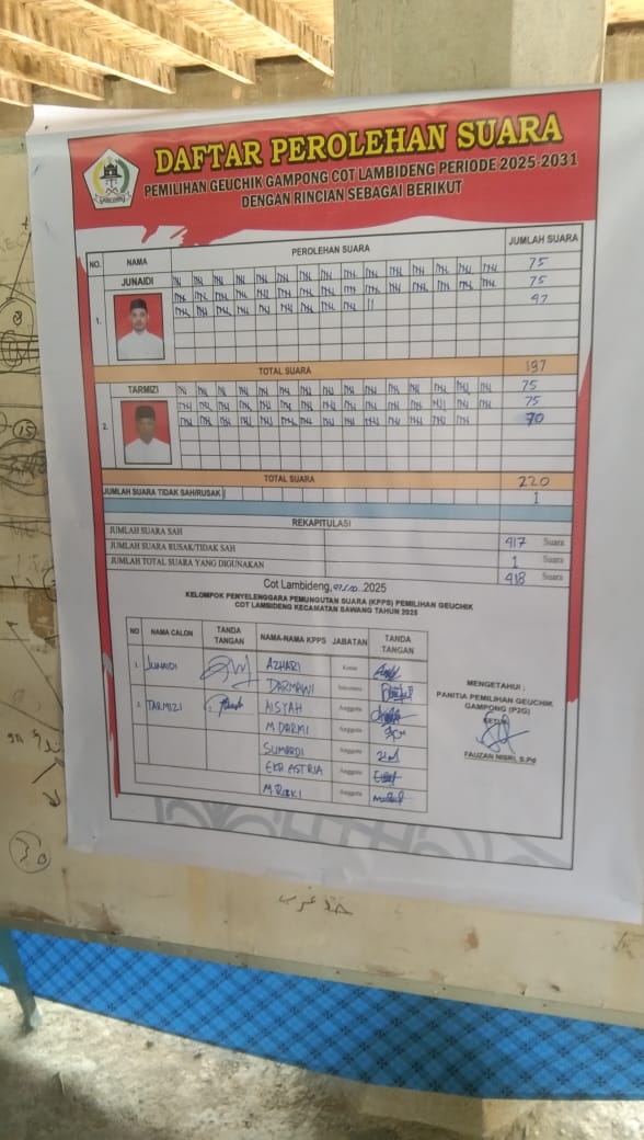 Dengan hasil tersebut ,Tarmizi resmi terpilih sebagai Geuchik Gampong Cot Lambideng periode mendatang, semoga bapak Tarmizi dapat membina masyarakat tanpa pilih kasih dan dapat membawa masyarakat gampong ini lebih maju lagi.(HS)